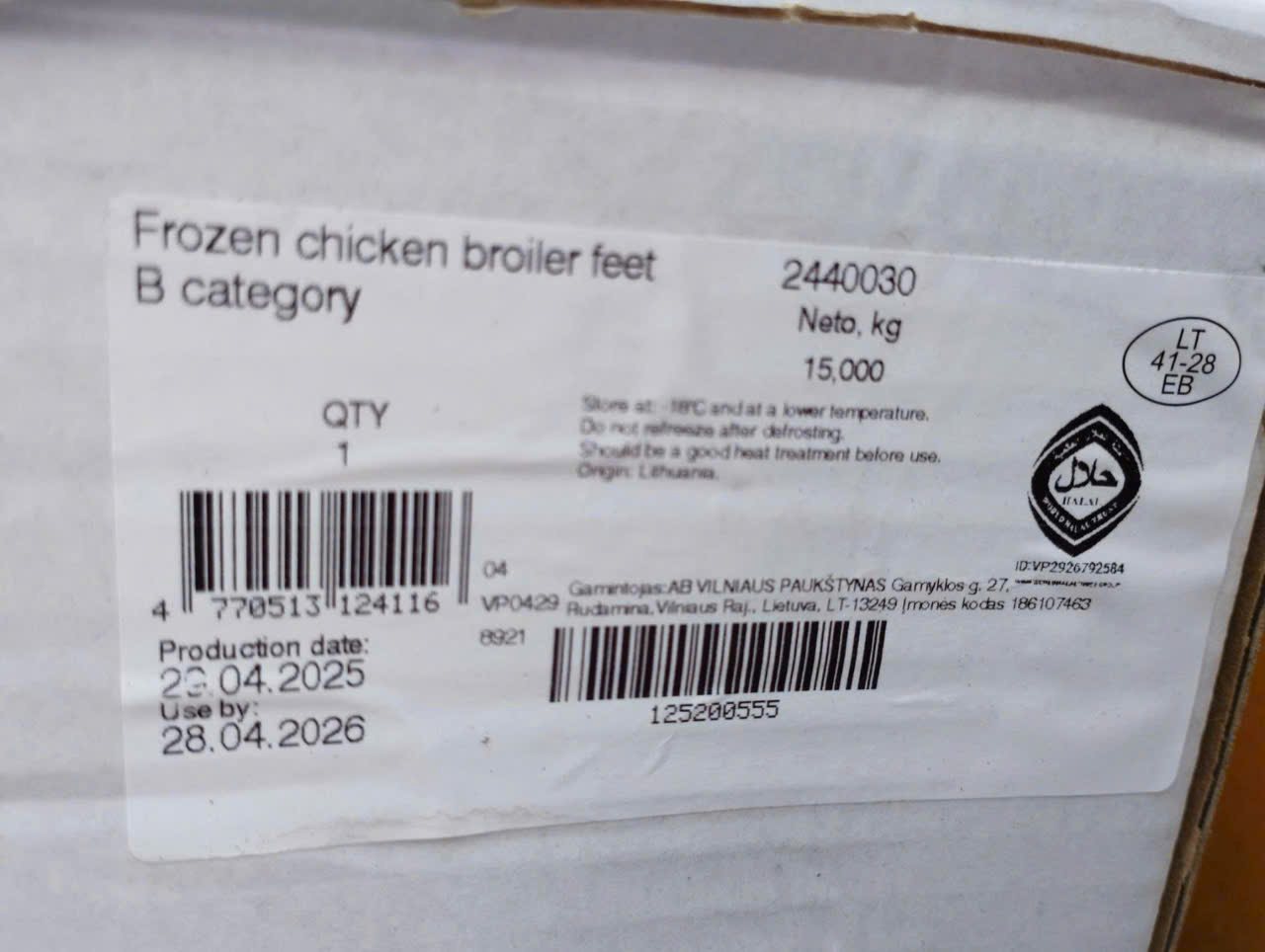 Tên sản phẩm: Frozen Chicken Broiler Feet (Chân gà Lithua AB – B Category)