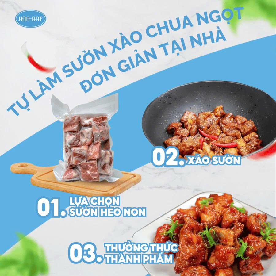 - Sườn xào chua ngọt: Sườn heo cắt miếng, luộc sơ qua để loại bỏ bớt chất béo. Sườn xào lăn qua dầu để miếng thịt săn lại. Tiếp tục cho hành phi vàng, cà chua, 1 chút đường, muối tiêu, nước mắm… tạo thành hỗn hợp chua ngọt. Cho sườn vào xào chín ngấm gia vị thì cho thêm hành lá vào.
