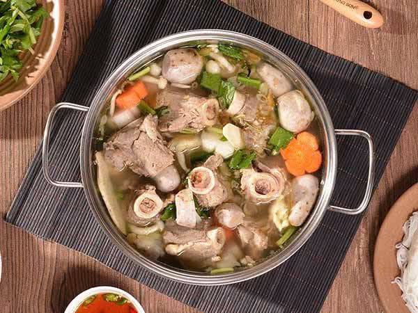 – Xương ống to, nặng thịt, mỡ vừa đủ — ninh nước ngọt đậm, trong veo, thơm tự nhiên